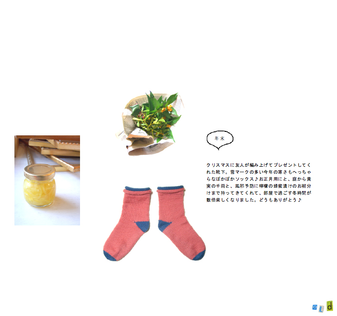 クリスマスに友人が編み上げてプレゼントしてくれた靴下。雪マークの多い今年の寒さもへっちゃらなぽかぽかソックス♪お正月用にと、庭から黄実の千両も持ってきてくれて、部屋で過ごす冬時間が数倍楽しくなりました。どうもありがとう♪