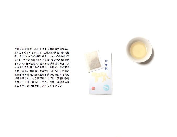 佐賀から届けてくれた手づくりお屠蘇で年初め。ぷ〜んと香るパックには、山椒(実)防風(根)桔梗根、白朮(オケラの根茎)桂皮(ニッケイの樹皮)丁