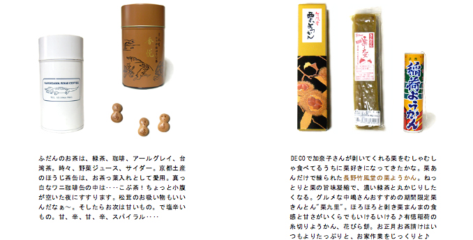 ふだんのお茶は、緑茶、珈琲、アールグレイ、台湾茶。時々、野菜ジュース、サイダー。京都土産のほうじ茶缶は、お茶っ葉入れとして愛用。真っ白なワニ珈琲缶の中は‥‥こぶ茶!ちょっと小腹が空いた夜にすすります。松茸のお吸い物もいいんだなぁ〜。そしたらお次は甘いもの。で塩辛いもの。甘、辛、甘、辛、スパイラル‥‥